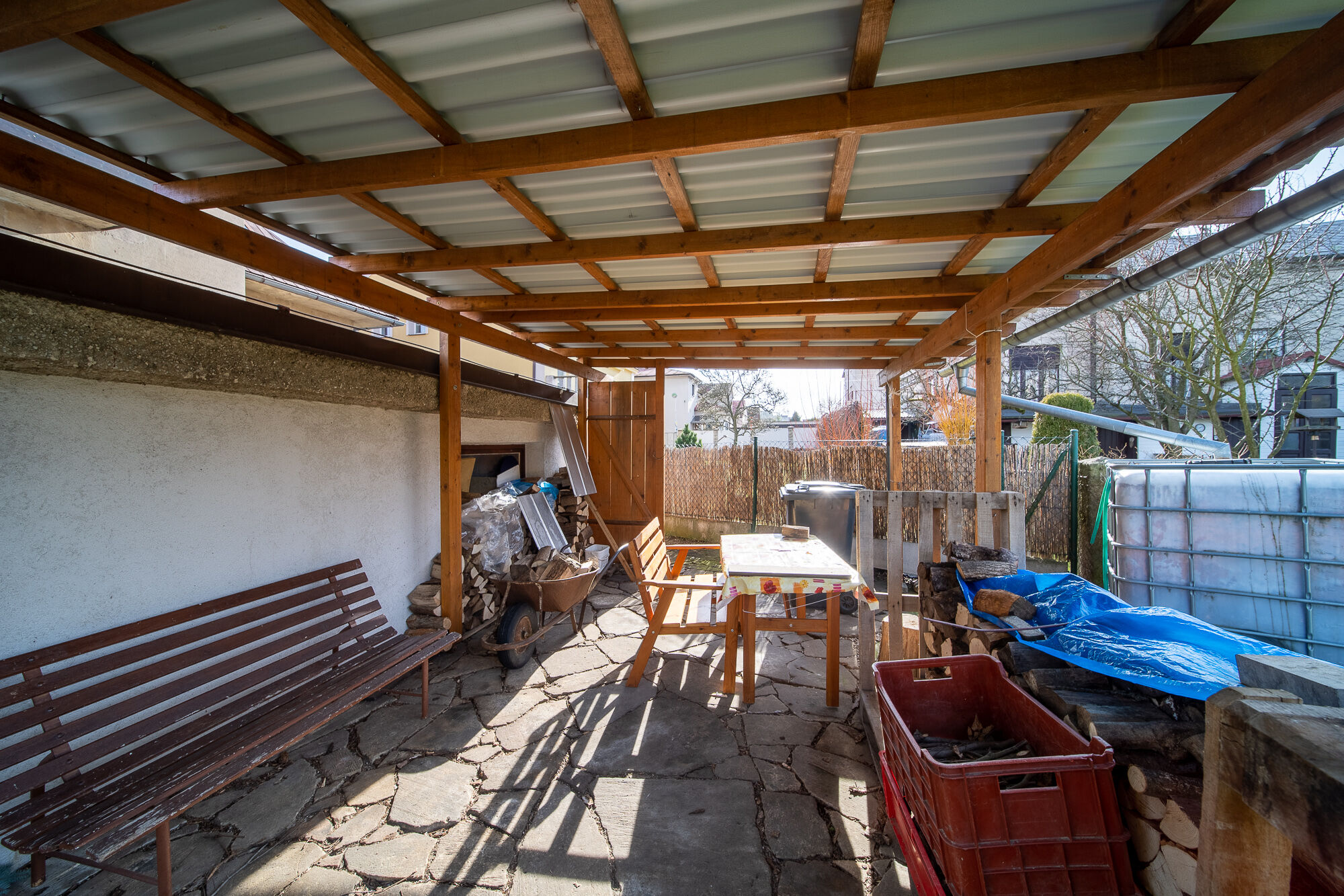 Zahrada, se vzrostlou okrasnou zelení a dřevěnou pergolou, Vám poskytne skvělé útočiště pro odpočinek či aktivní zábavu u grilování s rodinou či přáteli.